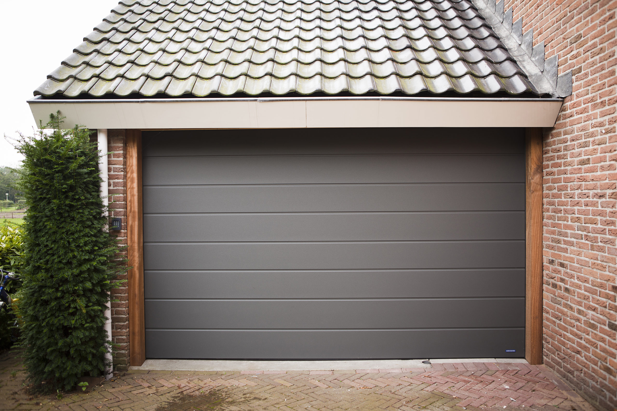 AW Nederland | AW40 sectionaaldeur met D1P aluminium loopdeur, breed geprofileerd woodgrain, RAL 6009 Door Annemarie24 maart 2017Laat een reactie achter